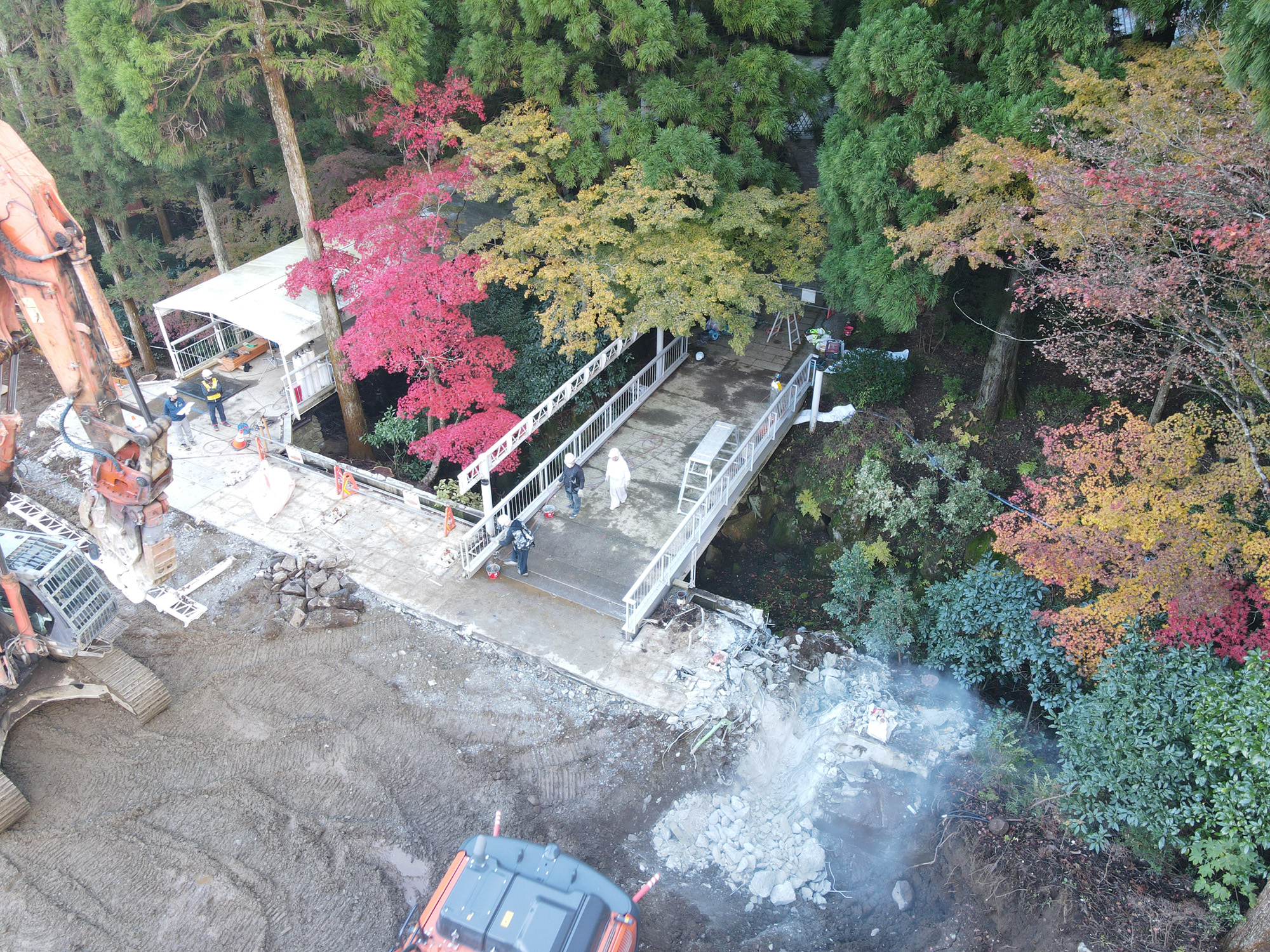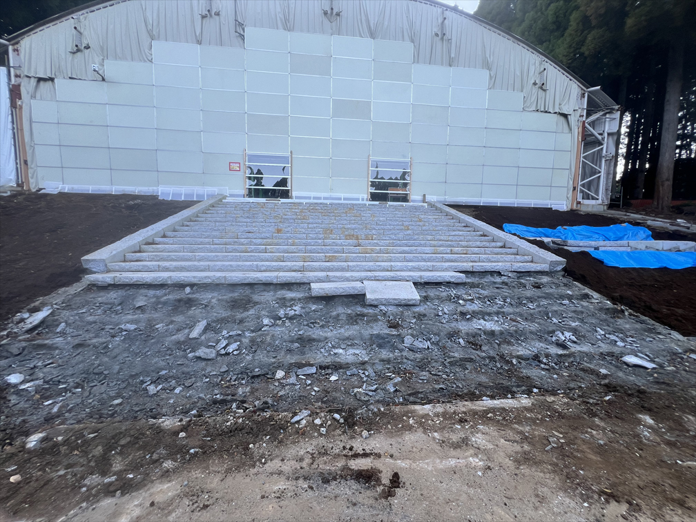 Demolishing Works: Demolishing the steps of temporary Komyo Kaikan, Removal of demolition materials.