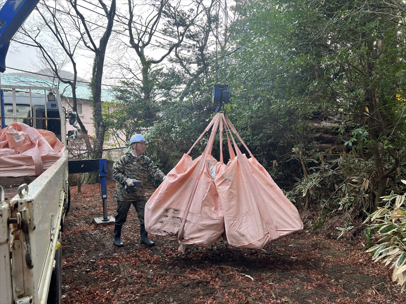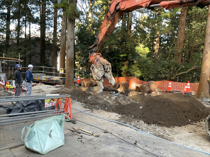 Demolishing the foundation of the temporary Komyo Kaikan (cobblestone surface work, transportation of reusable materials)