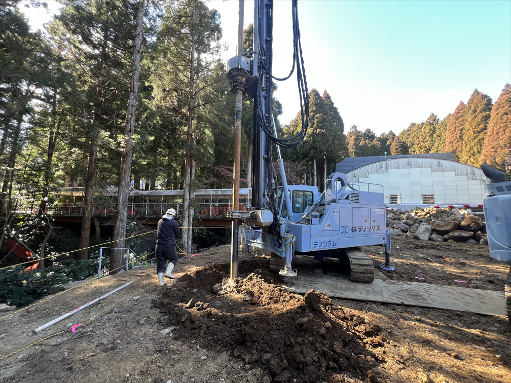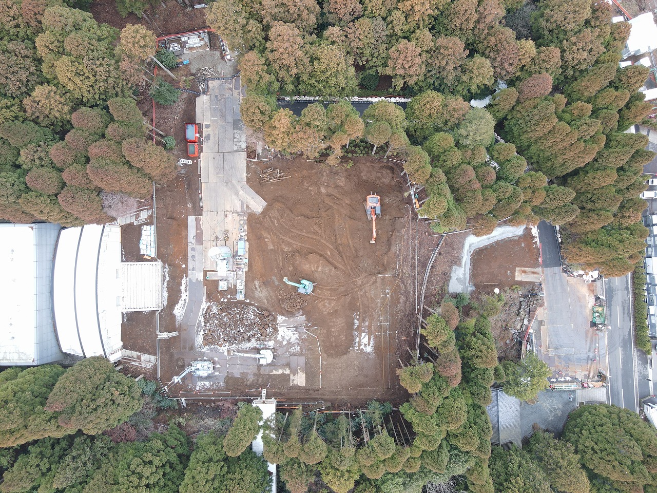 Demolishing Works: Demolishing the building of boiler room, interior of the restroom. Demolishing the roof of the open space and the front yard of the temporary Komyo Kaikan, and boring survey.