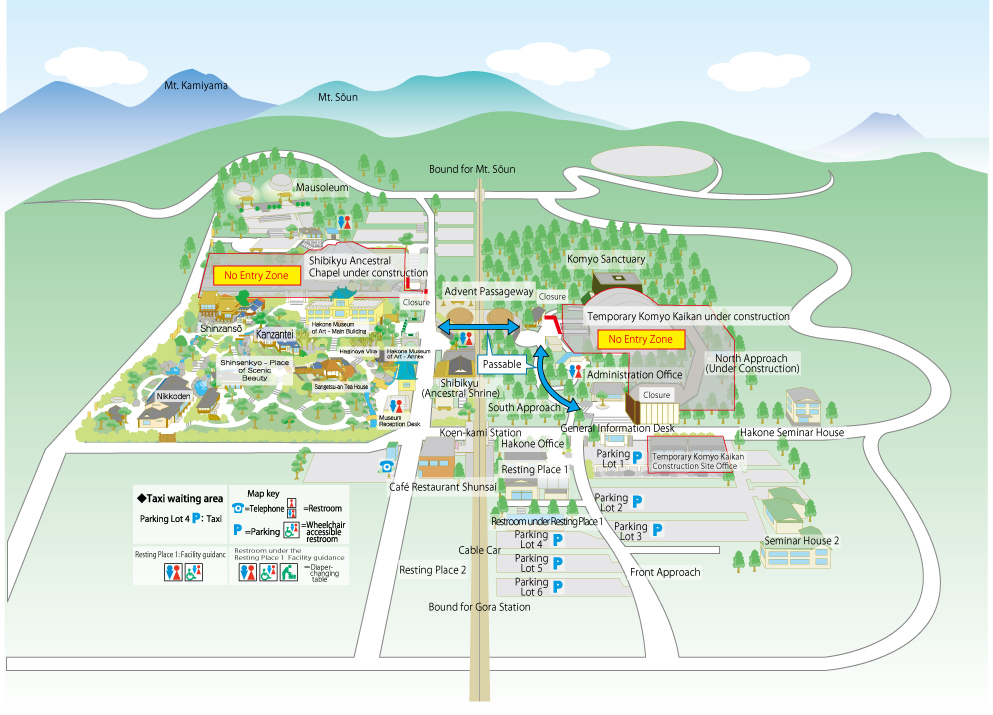 Due to the construction of renewing the worship facility (temporary Komyo Kaikan) in Gora, Hakone, there are currently some areas on the grounds that are restricted from entry and use.